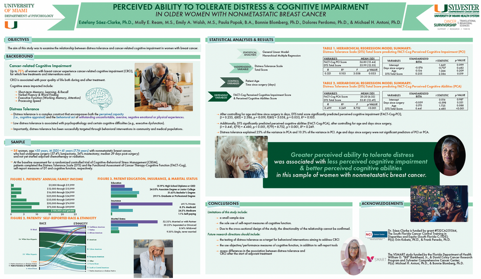 Sáez-Clarke, E., Ream, M., Walsh, E. A., Popok, P., Blomberg, B., Perdomo, D., & Antoni, M. A. (2021, November). Perceived ability to tolerate distress and cognitive impairment in older women with nonmetastatic breast cancer. Presented at the 2021 Sylvester Comprehensive Cancer Center Annual Retreat, Coconut Grove, FL.
