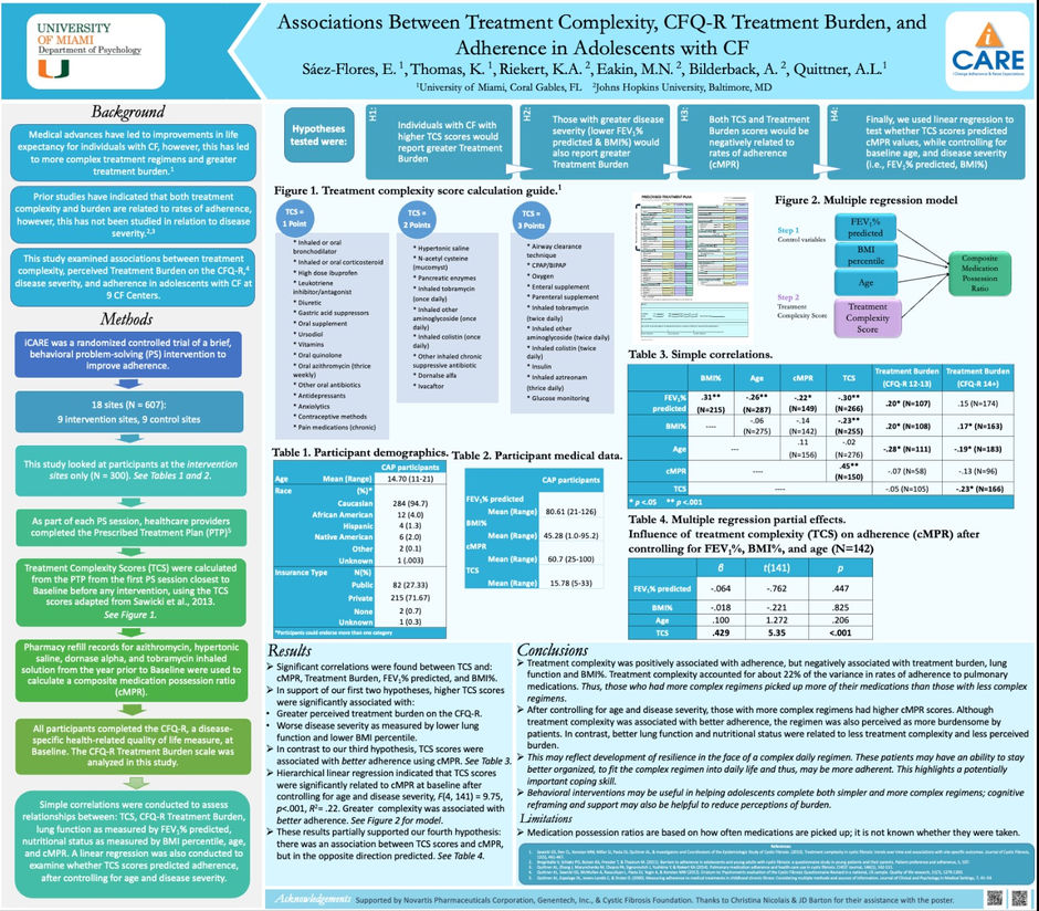 Sáez-Flores, E. (2019, March). Treatment complexity in cystic fibrosis. Presented at the Graduate and Postdoctoral Research Symposium, University of Miami, Coral Gables, Fl.